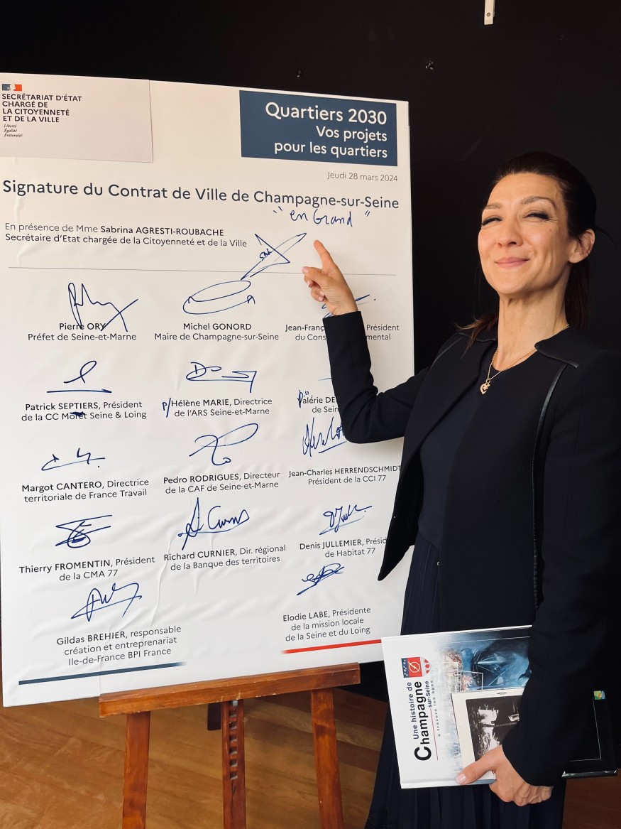 La secrétaire d'Etat chargée de la politique de la ville est venue signer un contrat en Seine-et-Marne jeudi. Celui de Champagne-sur-seine, dont une partie vient d'entrer dans les quartiers prioritaires, sur la base de chiffres sociaux et économiques... Ce qui va permettre des fonds de l'Etat. Sabrina Agresti-Roubache, la secrétaire d'Etat.