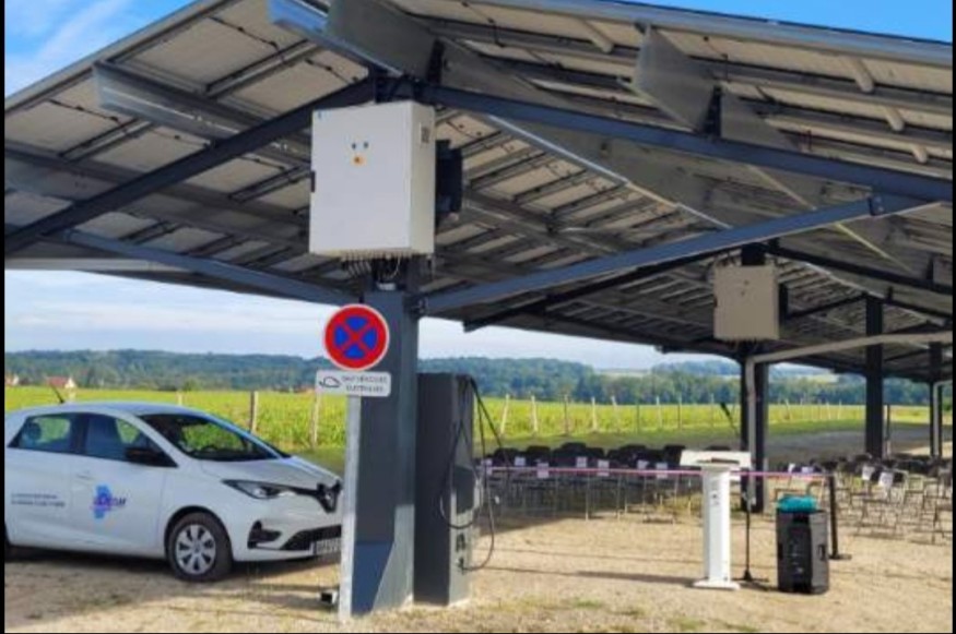Quand un village accueille des panneaux photovoltaïques pour alimenter une borne de recharge électrique... Machault, au nord de Fontainebleau et Montereau, près de l'autoroute A5, a inauguré lundi ce qu'on appelle un ombrière photovoltaïque, à l'itnitaitve du Syndicat des énergies de Seine-et-Marne (SDESM). Le maire Christian Poteau.