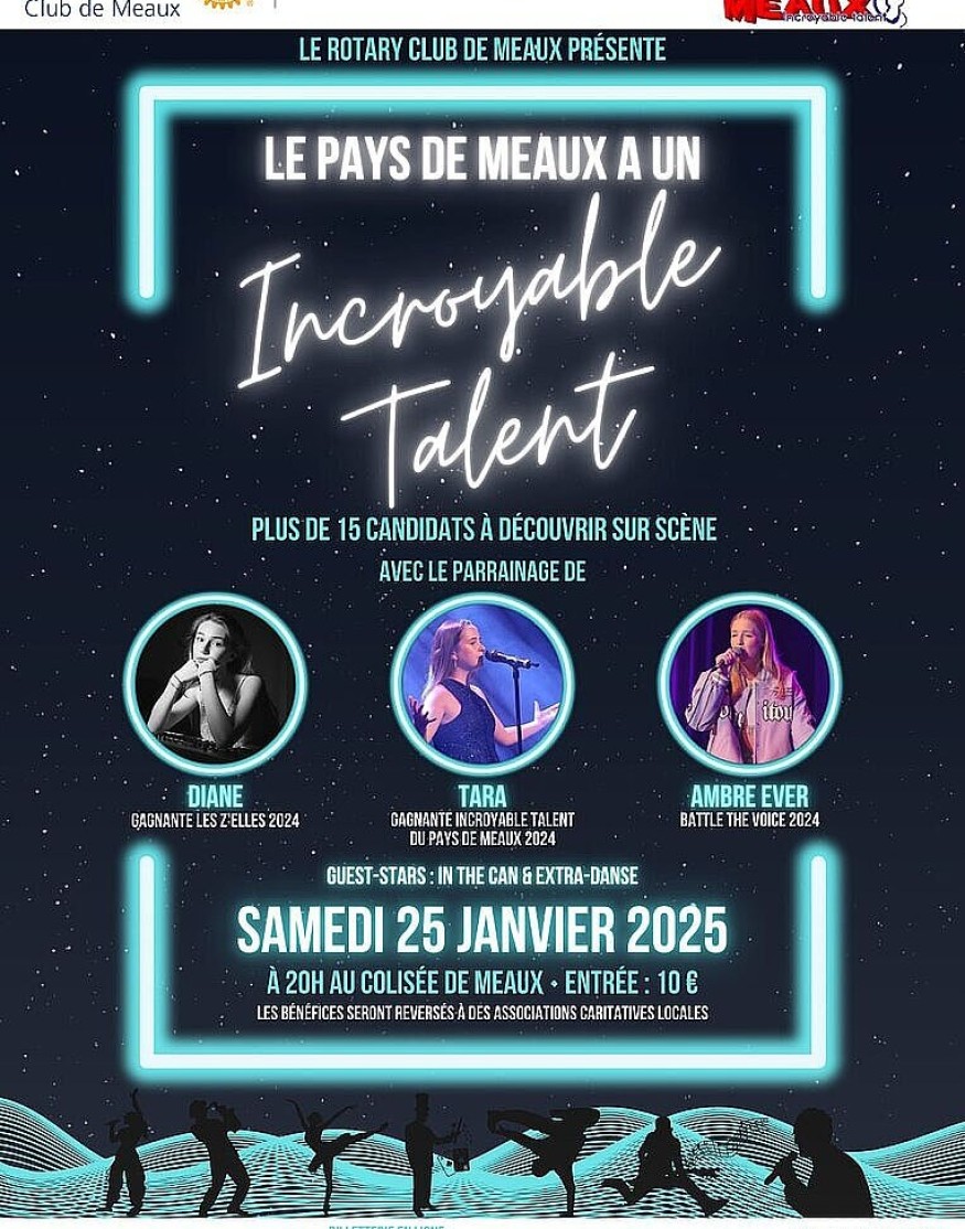 La soirée Le Pays de Meaux a un incroyable talent aura lieu samedi à partir de 20h dans la salle du Colisée. Troisième édition avec 14 candidats qui vont s'affronter sur scène devant un jury pour remporter le concours. Danseurs, chanteurs, hypnotiseur, mentaliste ou encore sportifs tenteront de convaincre le public. Comptez 10 euros l'entrée, avec les bénéfices remis à des associations locales.
