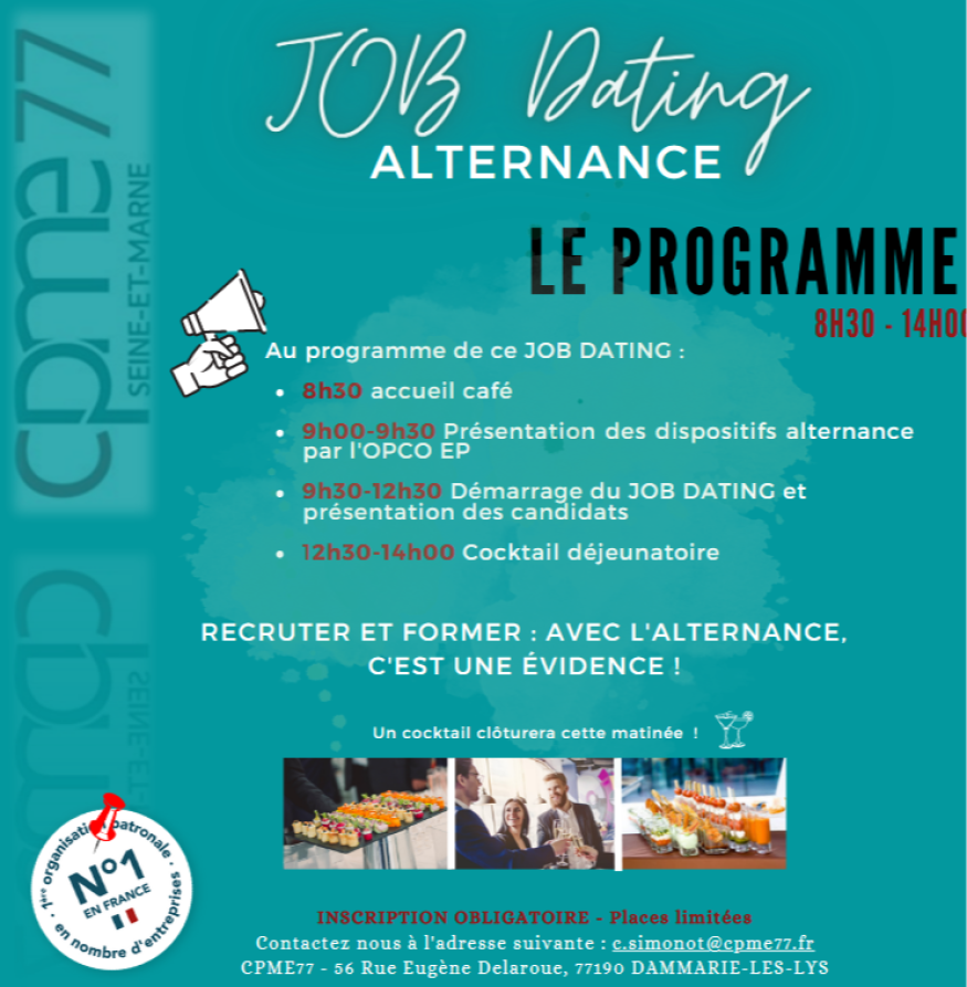 Le job dating spécial alternance le 26 septembre à Chailly en bière. Inscriptions sur le site cpme77.fr.
