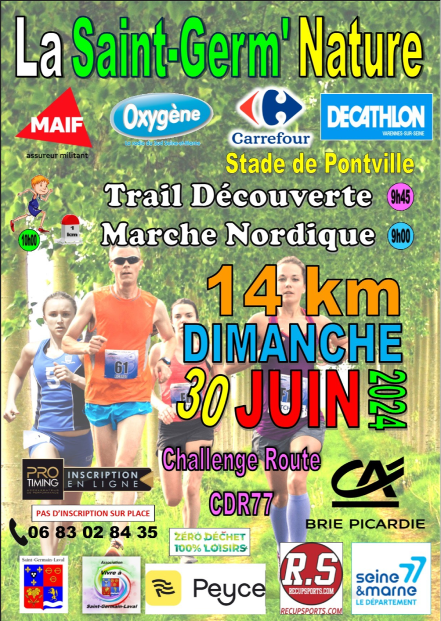 La course la Saint Germ Nature revient dimanche 30 juin avec un parcours de 14 kilomètres dans et autour du village du sud Seine et marne. Possibilité de la réalise en courant ou en marche nordique. Avec des animations. Inscriptions via le site protiming jusqu'au vendredi soir.