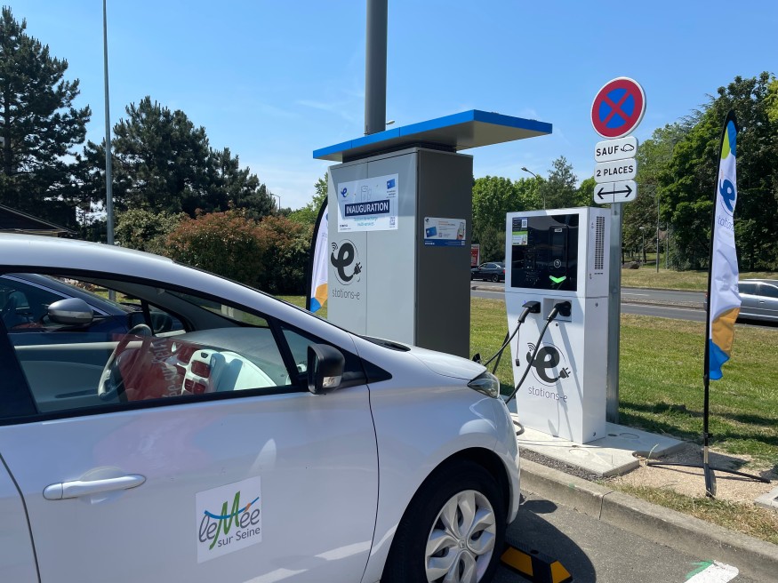 Des bornes de recharge électrique pour voitures installées devant la salle du Mas, au Mée sur Seine. Jeudi, les élus et l'entreprise Stations-E ont inauguré ce nouvel équipement. Préparation de l'avenir selon le maire Franck Vernin.