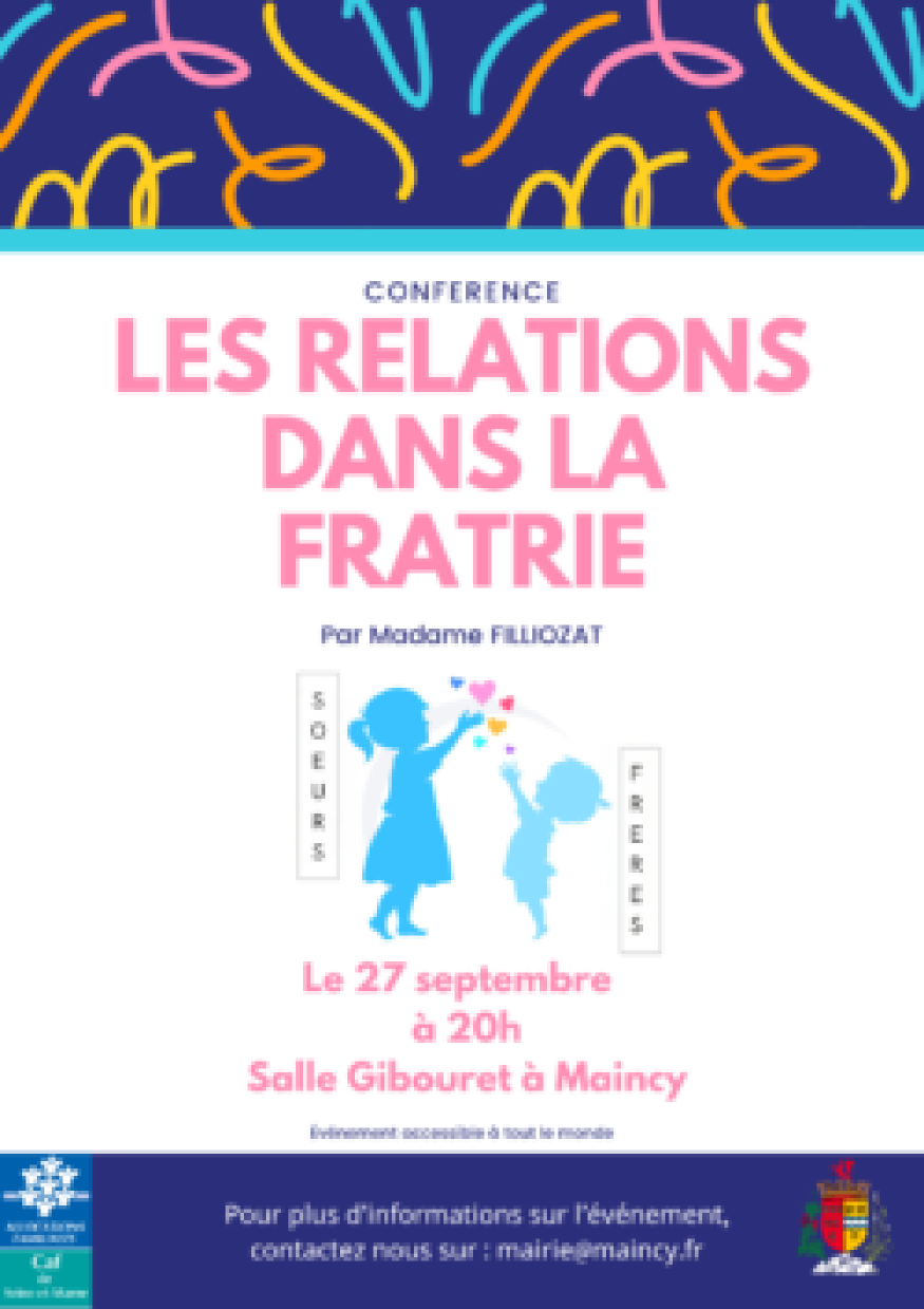 A Maincy, une conférence est proposée le vendredi 27 septembre en soirée dans la salle Gibouret. Une spécialiste de l'éducation des enfants, Isabelle Filliozat, va venir parler de la relation dans les fratries. Plus d'informations et réservation par mail à mairie@maincy.fr.