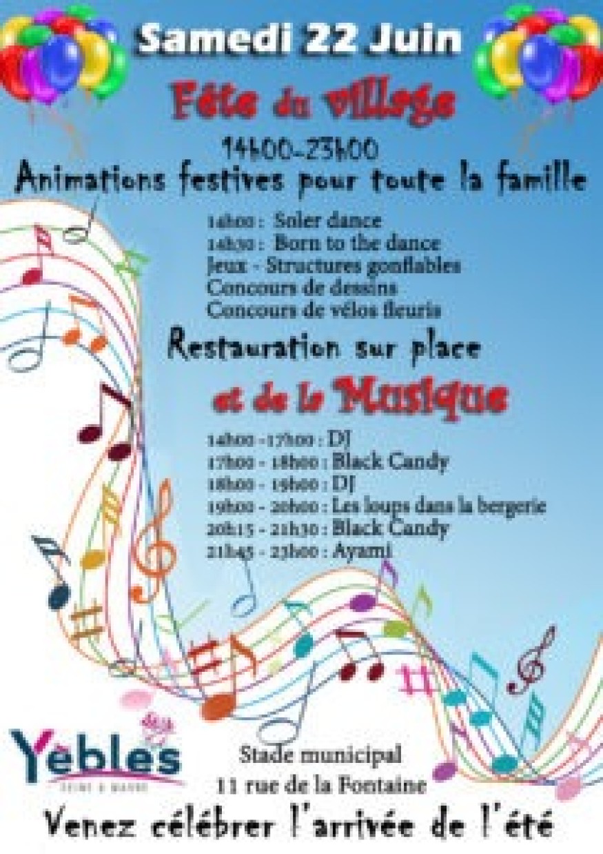 A Yèbles, la fête du village et de la musique est organisée samedi après-midi au stade municipal. Au programme, dès 14h30, des jeux, des animations, de la danse, de la musique... Avec un service de petite restauration sur place.